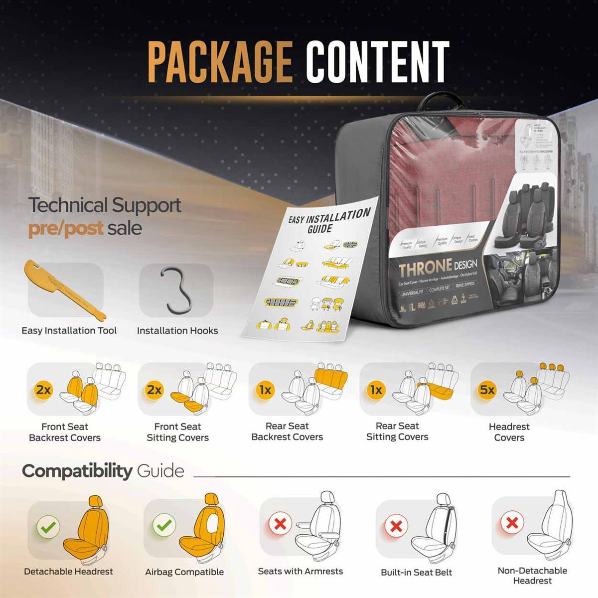 Pokrowce posiadają zamki w tylnej kanapie, dzięki czemu pasują do większości siedzeń dostępnych na rynku, (kanap niedzielonych, dzielonych prawo jak i lewostronnie). Możemy bez problemu złożyć oparcia, aby zwiększyć przestrzeń bagażową.