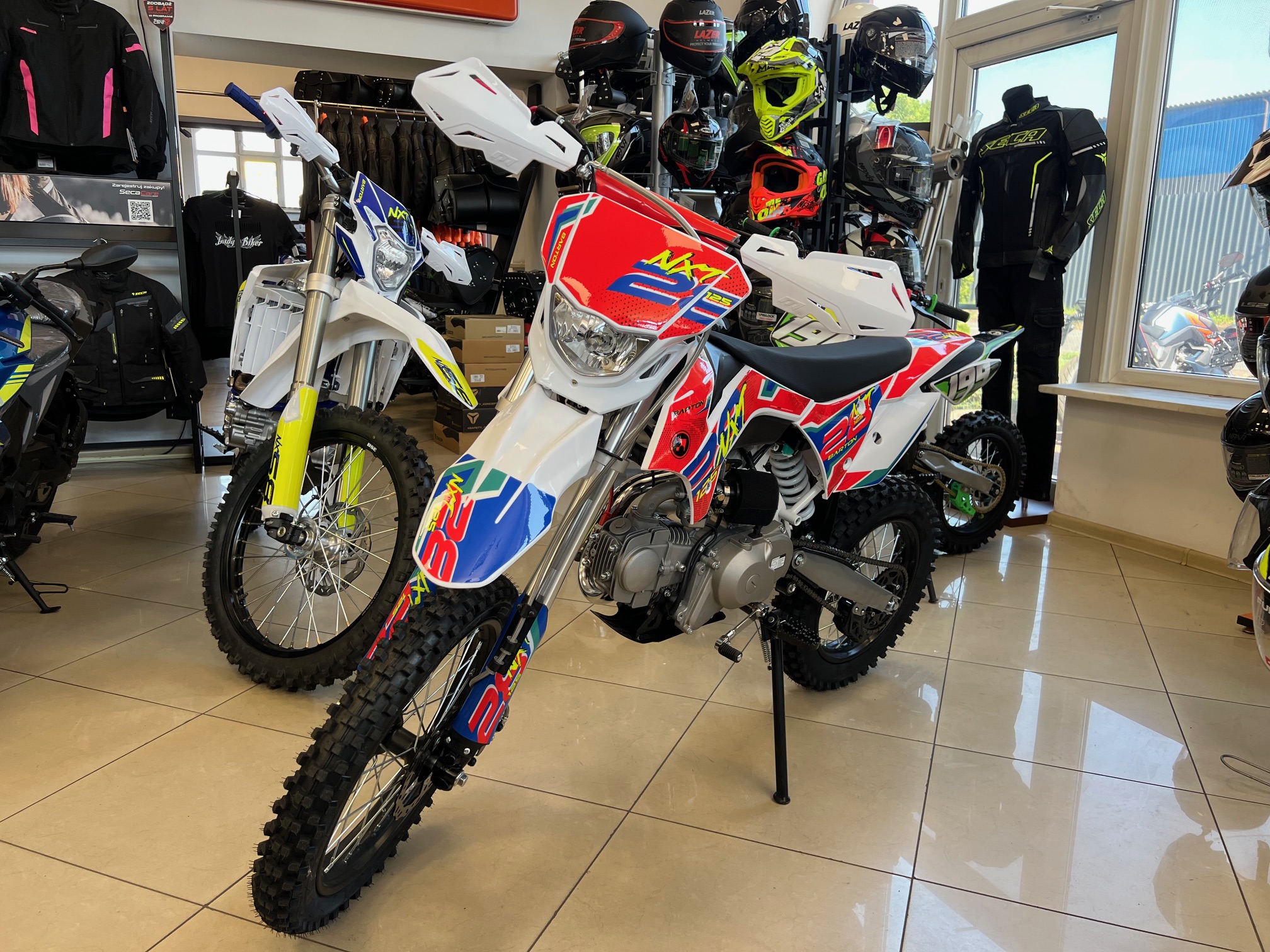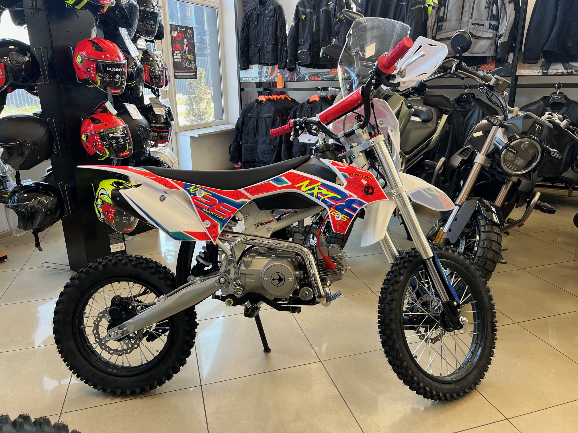 Zabawę czas zacząć! Mały, zwinny i niepozorny, taki jest NXT 125. Wzmocniona konstrukcja wahacza i gąbkowy filtr powietrza rodem z profesjonalnych motocykli off roadowych zachęca do dynamicznej jazdy po bezdrożach. Za wybieranie nierówności odpowiedzialne jest zawieszenie up-side down, które dzielnie radzi sobie na wyboistych drogach. Sercem jest jednocylindrowy silnik czterosuwowy, chłodzony powietrzem o mocy 9KM, który razem z czterobiegową skrzynią zapewnia nam dużo frajdy z jazdy. Producent w tym przypadku ułatwia nam zadanie, ponieważ NXT 125 został wyposażony w rozrusznik! Oczywiście, elektryczny starter nie wyparł klasycznego kickstartera, dzięki temu, nożny rozruch jest świetnym wyjściem awaryjnym w sytuacji, kiedy nasz akumulator z niespodziewanych przyczyn chciałby odmówić posłuszeństwa z dala od domu. Akumulator znajdziemy w miejscu szybko dostępnym i łatwym do wymontowania/doładowania, znajduje się on pod siedzeniem. Siedzisko na wysokości 86 cm jest dobrą wiadomością dla większości jeźdźców, którzy odnajdą się na Bartonie NXT 125, a jazda będzie czystą przyjemnością.