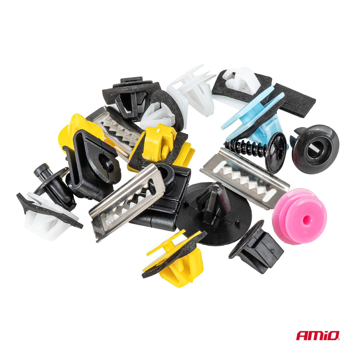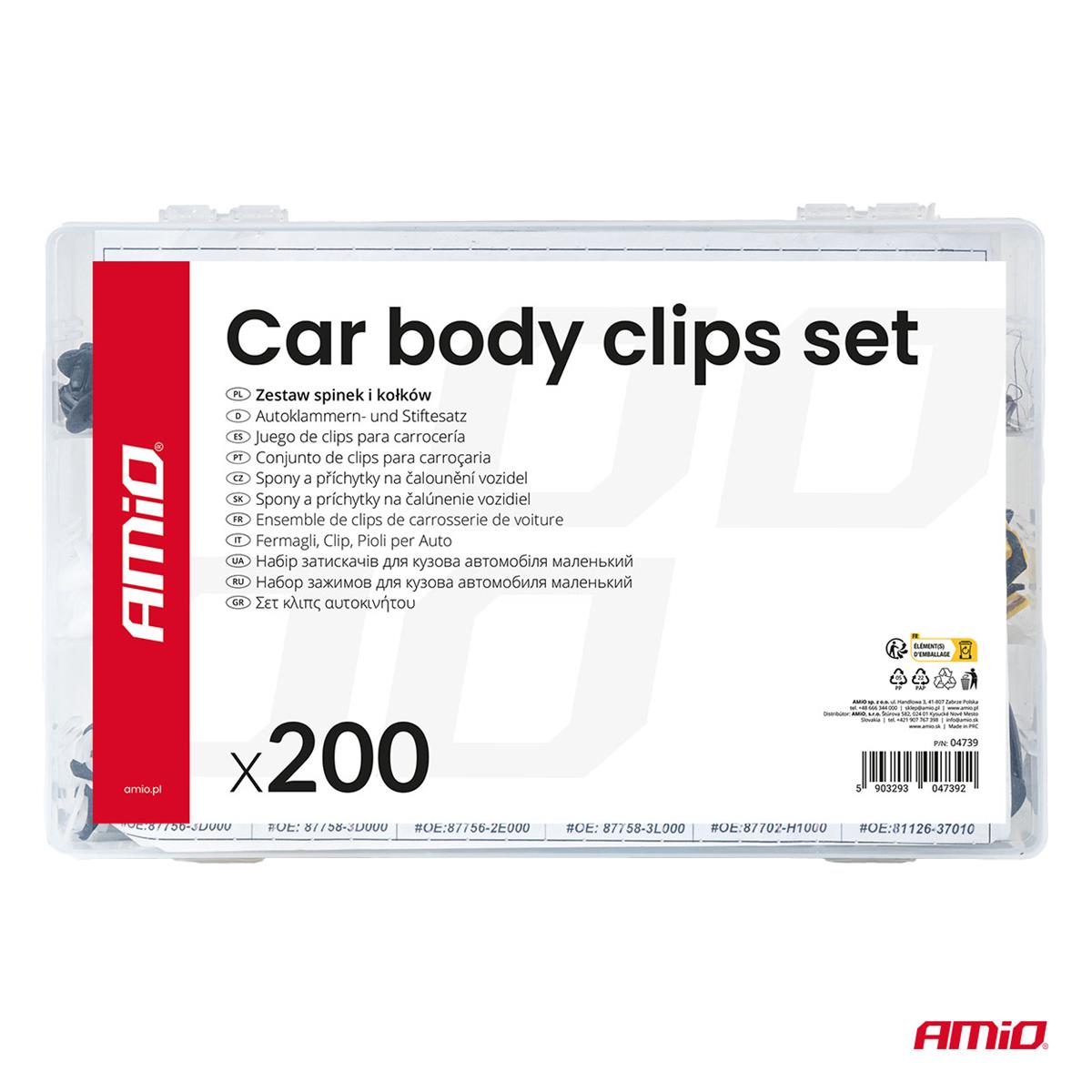Profesjonalny zestaw 200 spinek i kołków do montażu i naprawy nadwozi samochodowych, pozwalający na szybkie i bezpieczne mocowanie paneli, listew i osłon plastikowych.