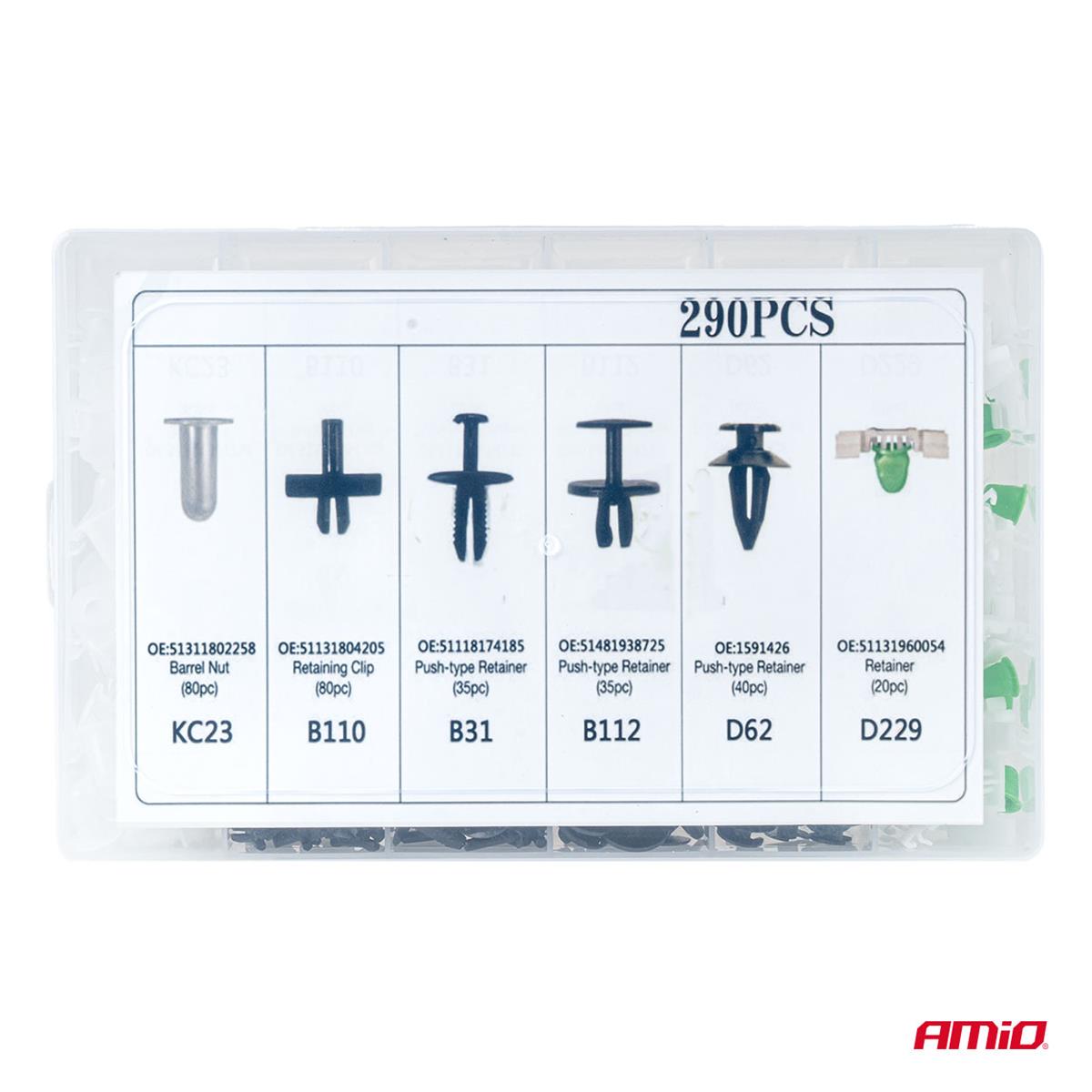 Zestaw spinek i kołków samochodowych 290szt. przeznaczony do naprawy, serwisu i konserwacji nadwozi samochodowych.