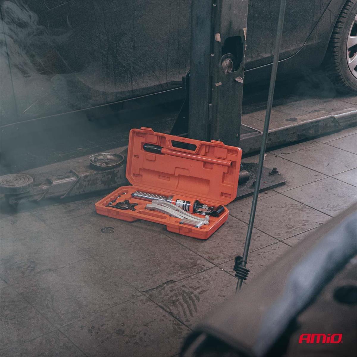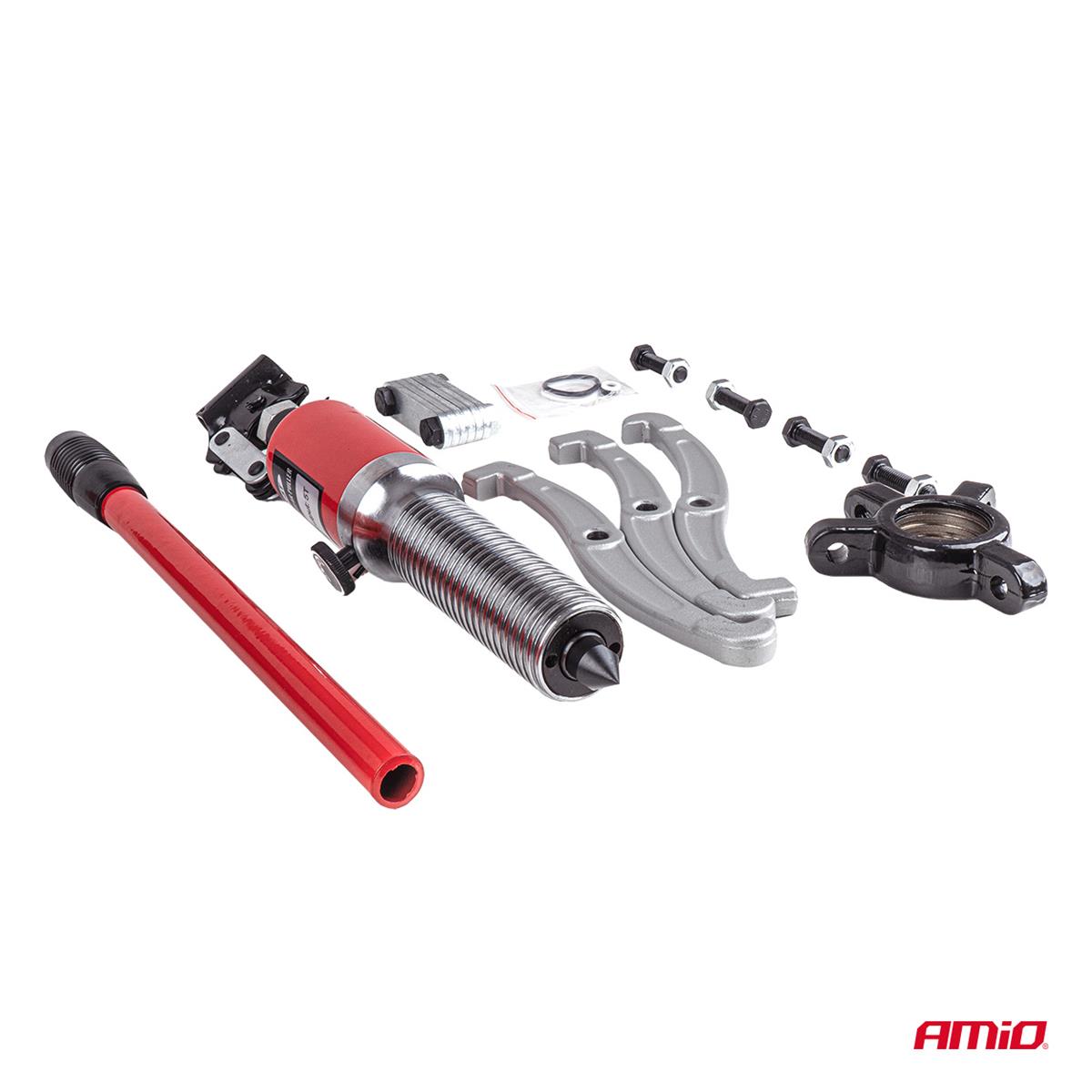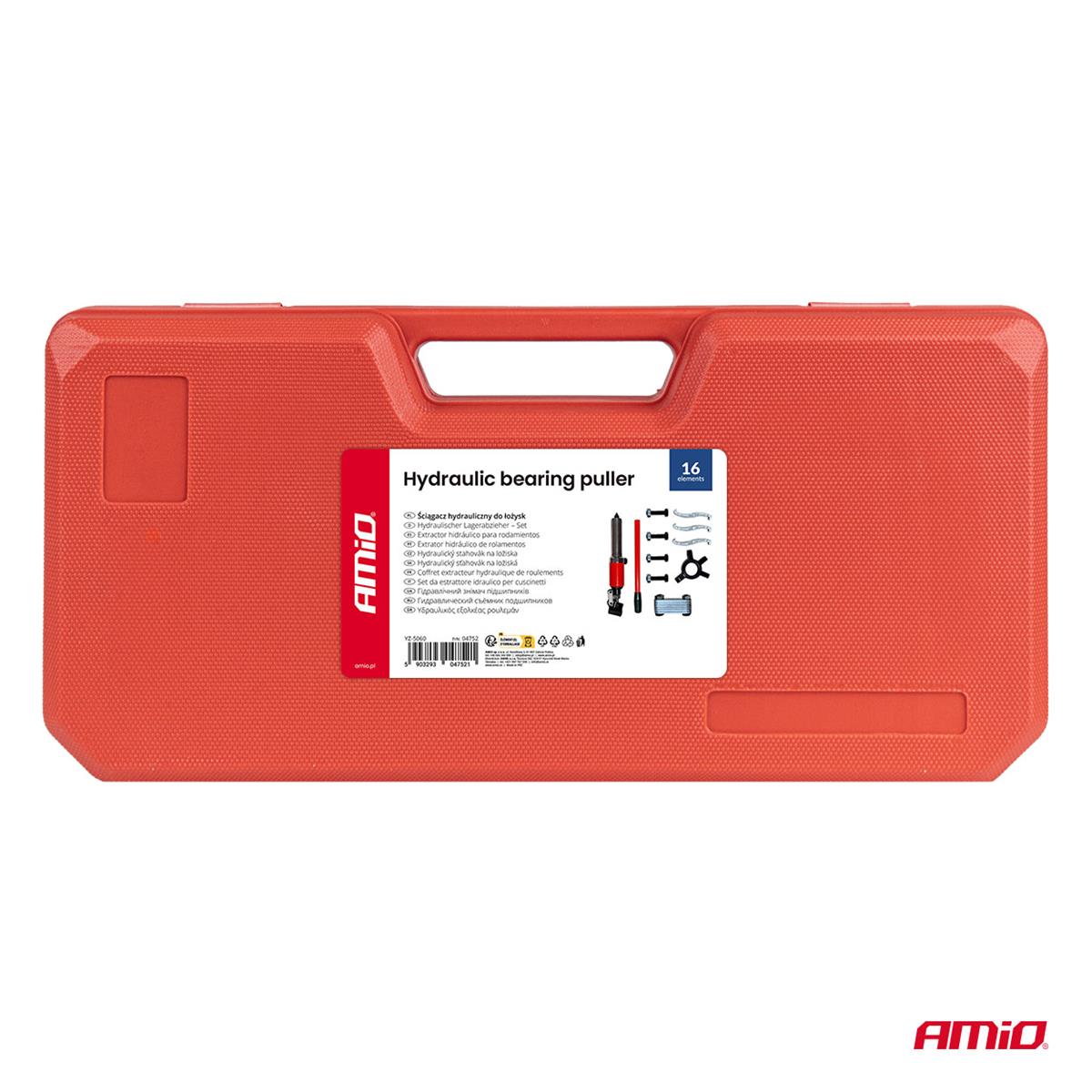 Ściągacz hydrauliczny do łożysk AMIO – zestaw 16 elementów do profesjonalnego demontażu łożysk o średnicy 50–200 mm.